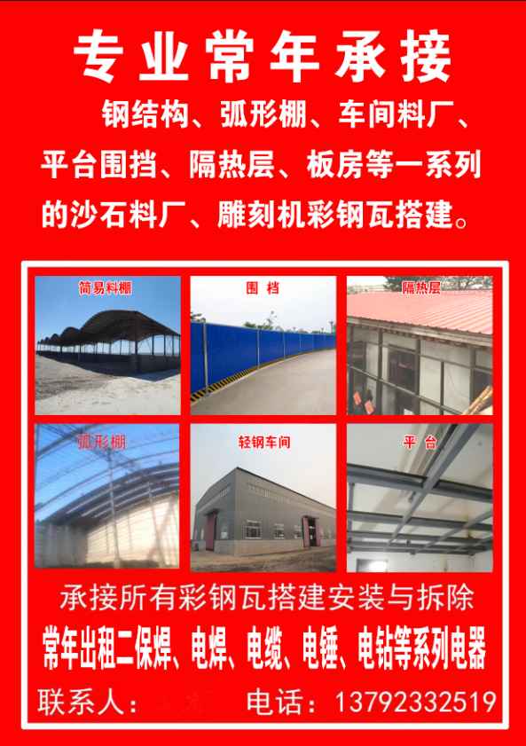 专业弧形棚,钢结构,换彩钢板,整改车间等!料场棚子,车间,平台,采光,隔热层,隔断等一系列的电焊活,常年有施工队!有需要的联系。